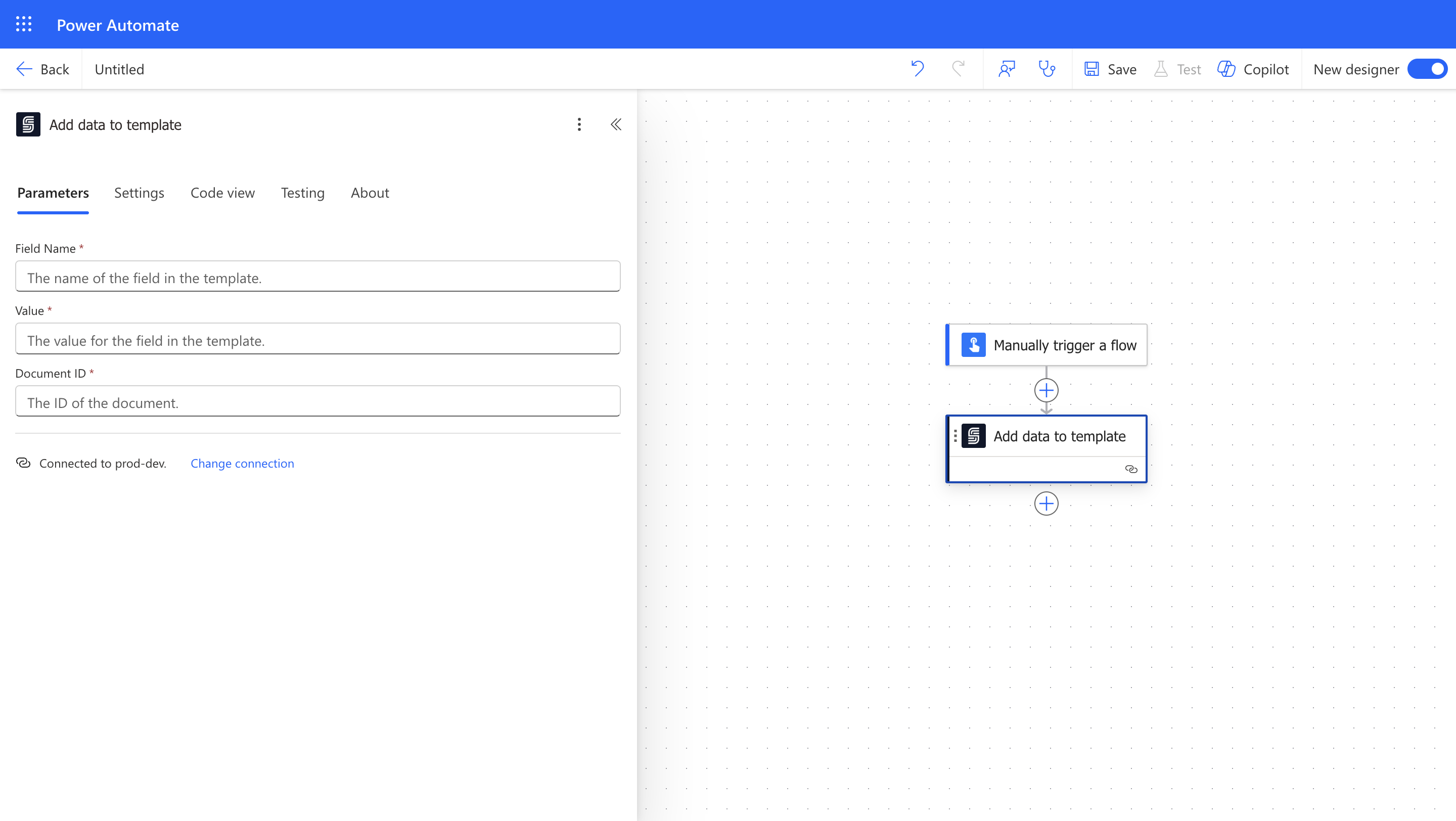 Use this action to add or merge data into a template. Before using this action, ensure you have added a template to your envelope.