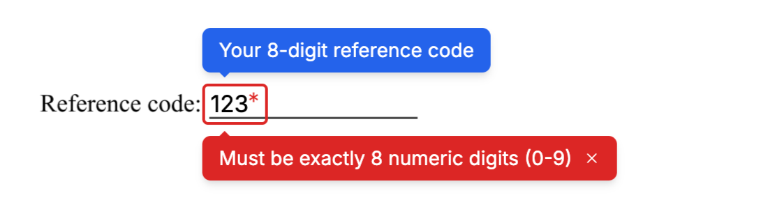 To guide users during input, you can include a format_message property. This message is displayed when the input doesn’t match the required format. For example: