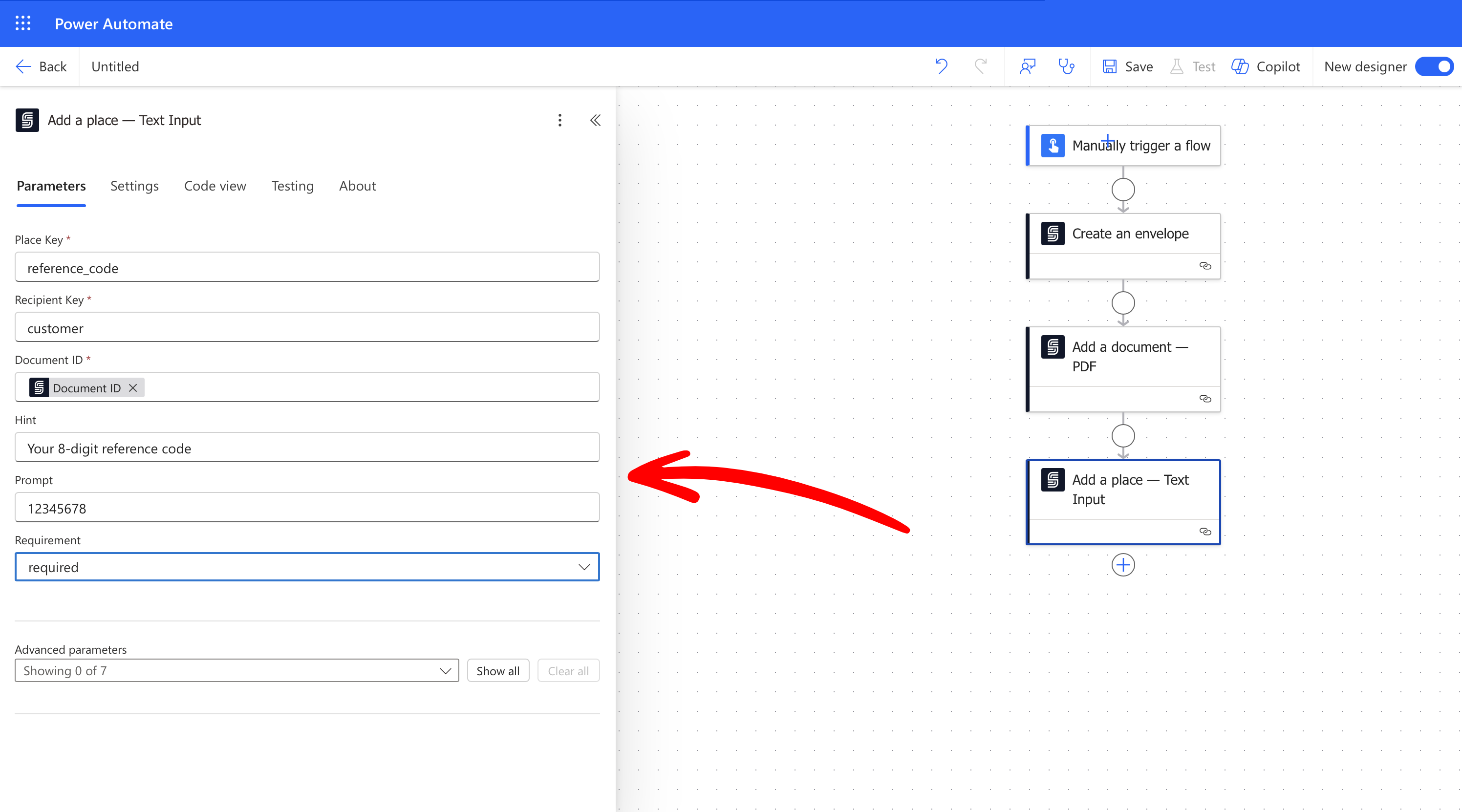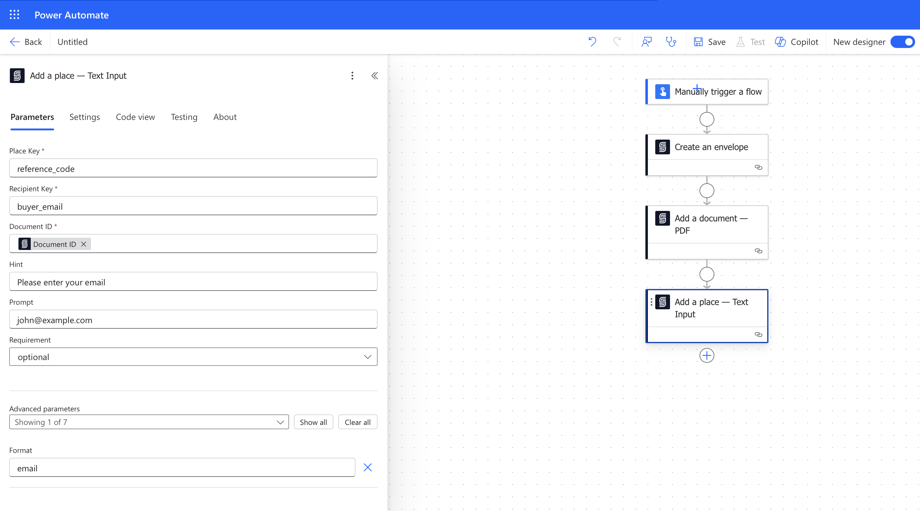 For example, a text input field can be used to place a text box at the placeholder [[buyer_email]]. This allows the recipient with the key “buyer” to provide their email address. This field is set to optional.